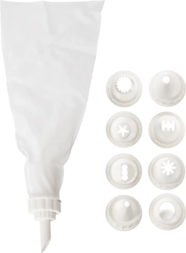 V balení najdete 9 různých nástavců pro hvězdičky, linky, tečky a květinové motivy. Praktické řešení umožňuje rychlou výměnu koncovky i během práce – bez nutnosti vyndávat náplň ze sáčku. Sada je skvělá i pro formování bez, plnění věnečků nebo zdobení slaných jednohubek.