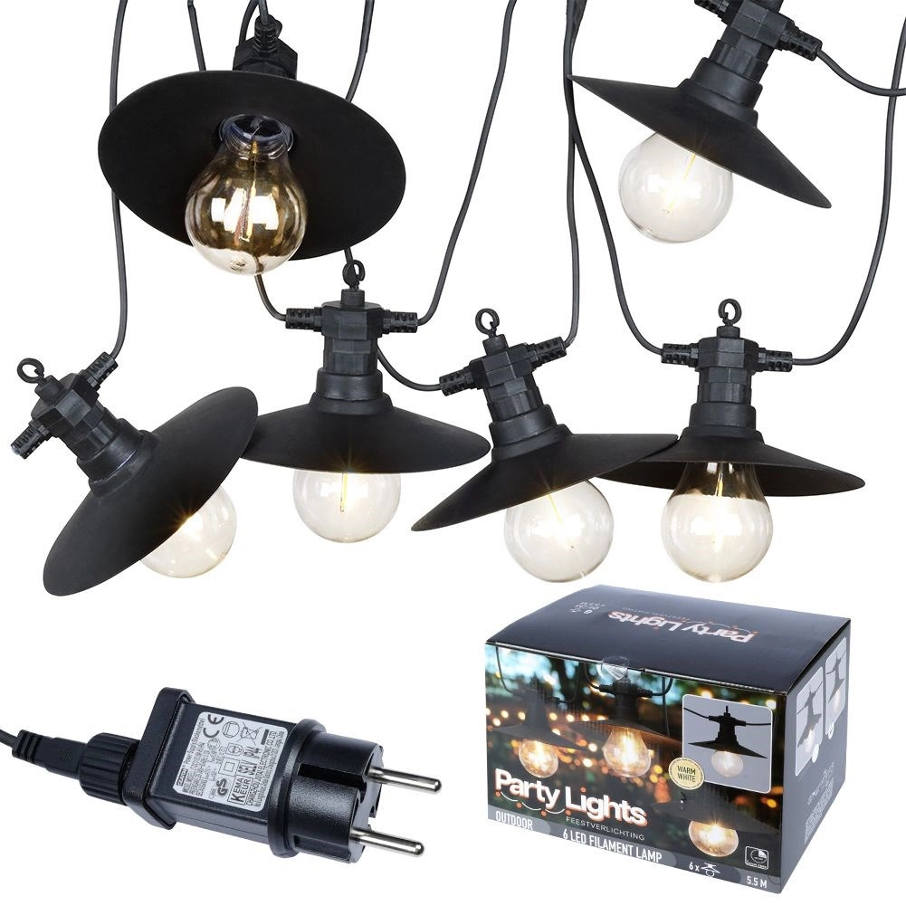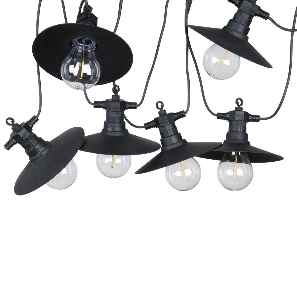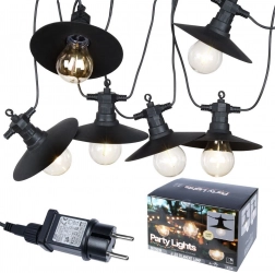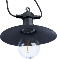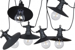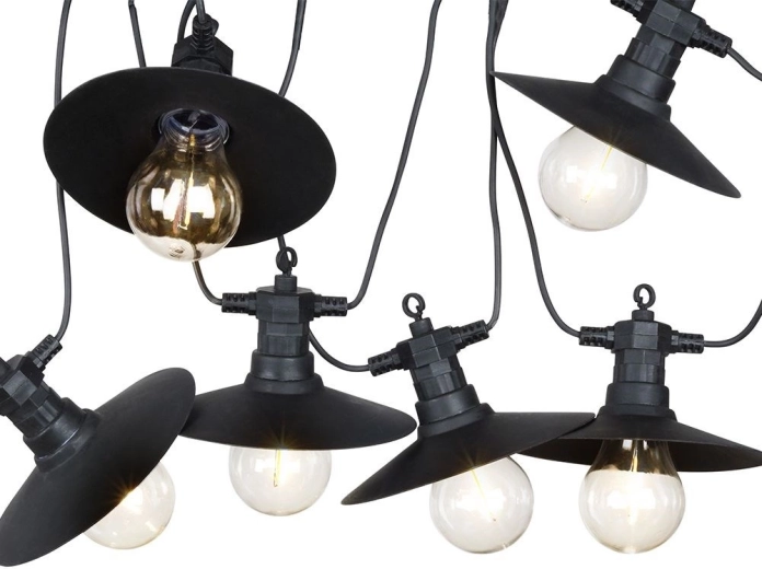 Tato odolná venkovní girlanda kombinuje elegantní černé kovové stínidla (Ø 15 cm) s čirými LED žárovkami (Ø 6 cm, délka 7 cm), které směrují světlo dolů a vytvářejí příjemné teplé osvětlení. Díky rozestupu 50 cm mezi žárovkami rovnoměrně nasvítí posezení, altán či zahradní párty.