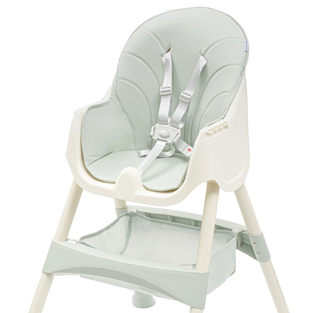 Stabilní konstrukce s protiskluzovými zakončeními nohou brání nechtěnému posunu a podnožka přidává komfort při sezení. Praktický látkový koš pod sedákem pojme vše potřebné – od ubrousků po malé hračky. Jednoduchou demontáží spodní části nohou židličku rychle přeměníte na nízkou židli pro hraní nebo samostatné sezení.