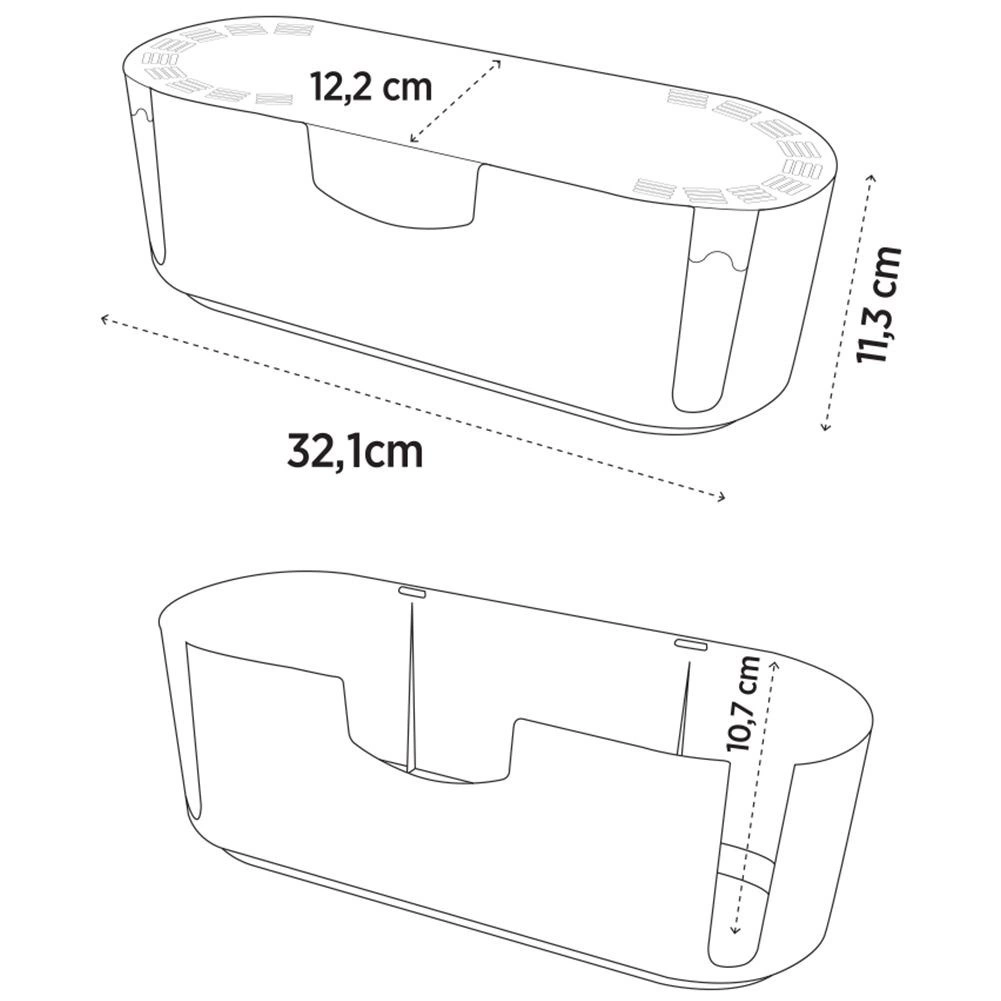 Praktický a odolný box na kabely VILDE pomůže zkrotit chaos kolem TV stolku, pracovního koutku i v kanceláři. Uvnitř pohodlně ukryjete prodlužovací přívod i adaptéry, na bocích jsou průchody pro čisté vedení kabelů a ve víku větrací otvory pro bezpečné proudění vzduchu. Tím se snižuje riziko přehřívání a nechtěného odpojení.