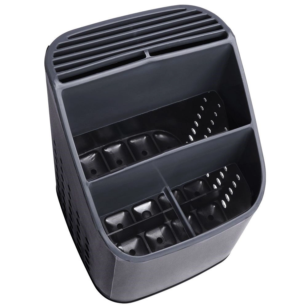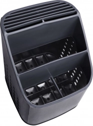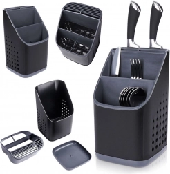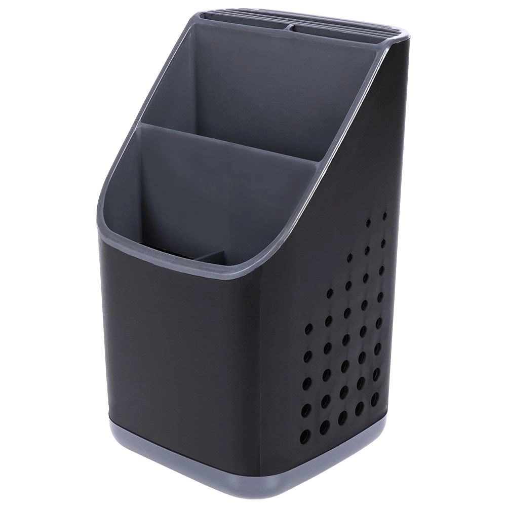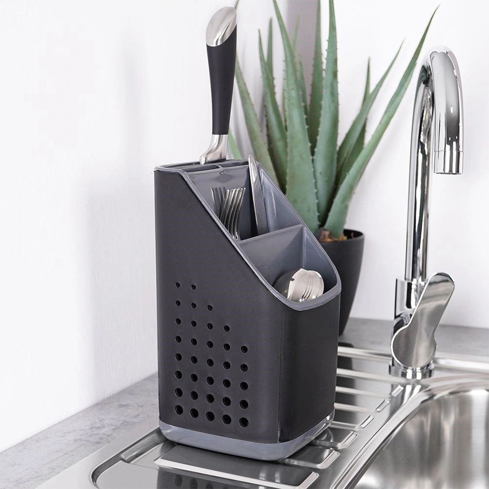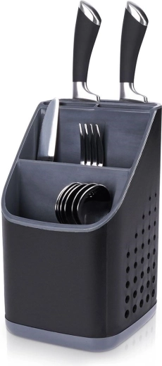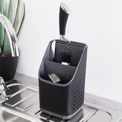 Vysoce kvalitní plast v černé barvě s grafitovými detaily působí moderně a hodí se do většiny kuchyní. Při vyjmutí vnitřního organizéru získáte prostorný jednokomorový kontejner například na větší náčiní. Díky kompaktním rozměrům se vejde na odkapávač dřezu i na pracovní desku a nijak nepřekáží.