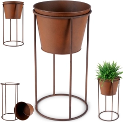 Stylový kovový květináč na vysokém stojanu o celkové výšce 44 cm dodá interiéru i exteriéru jedinečný nádech. Má rustikální retro vzhled, stabilní kruhovou základnu a kvalitní kovové provedení s drsnou strukturou v rezavé barvě. Ideální pro živé i umělé rostliny a bylinky, skvěle vynikne v obýváku, na balkoně, terase i v kanceláři.