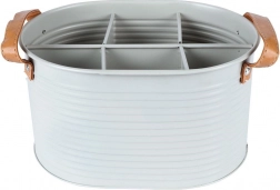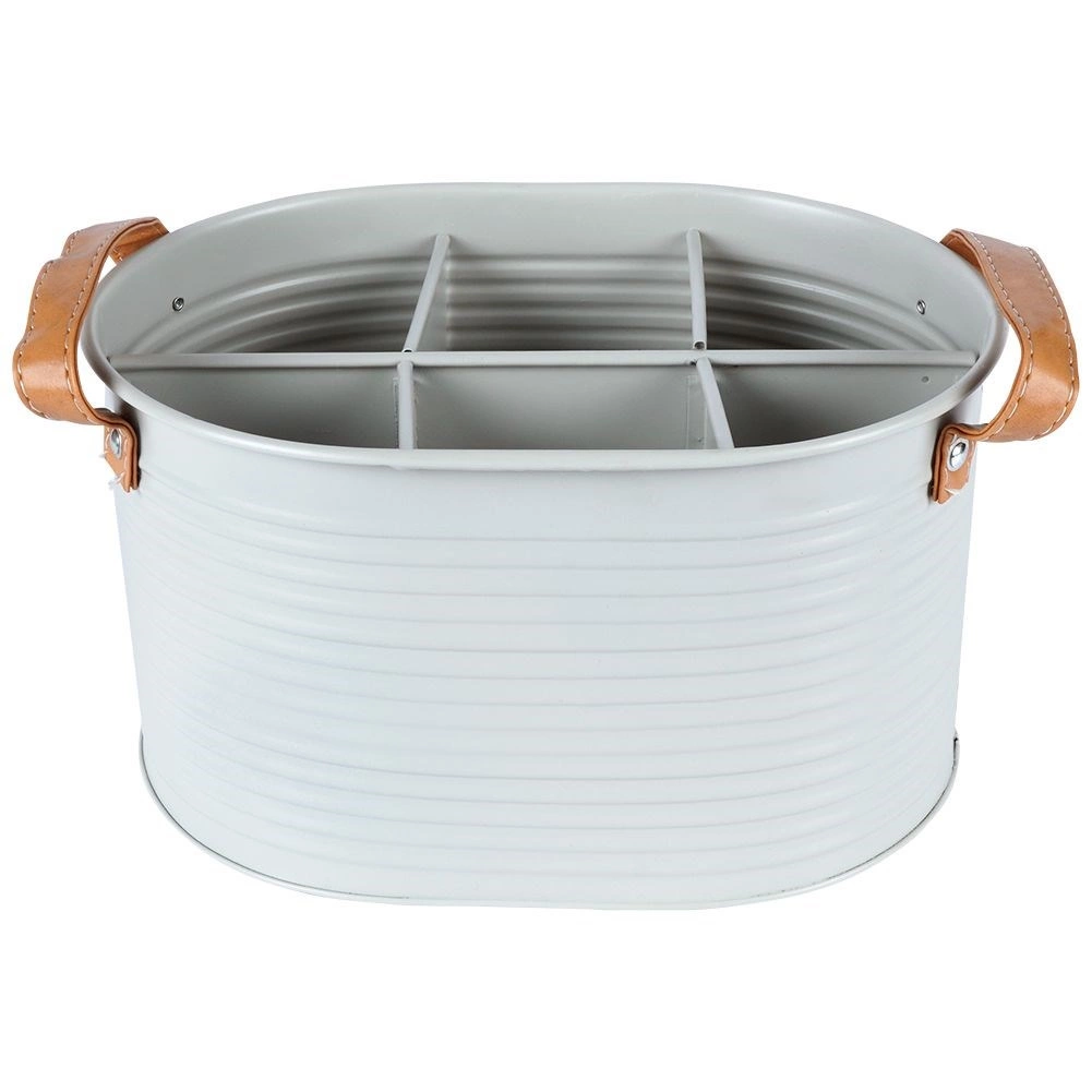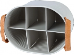 Elegantní a odolný organizér pro přenášení nápojů, který kombinuje funkčnost a stylový design. Světlý šedý kov s ryhovaným povrchem je odolný proti každodennímu používání, zatímco hnědé kožené úchyty zajišťují komfortní úchop a snadný transport.