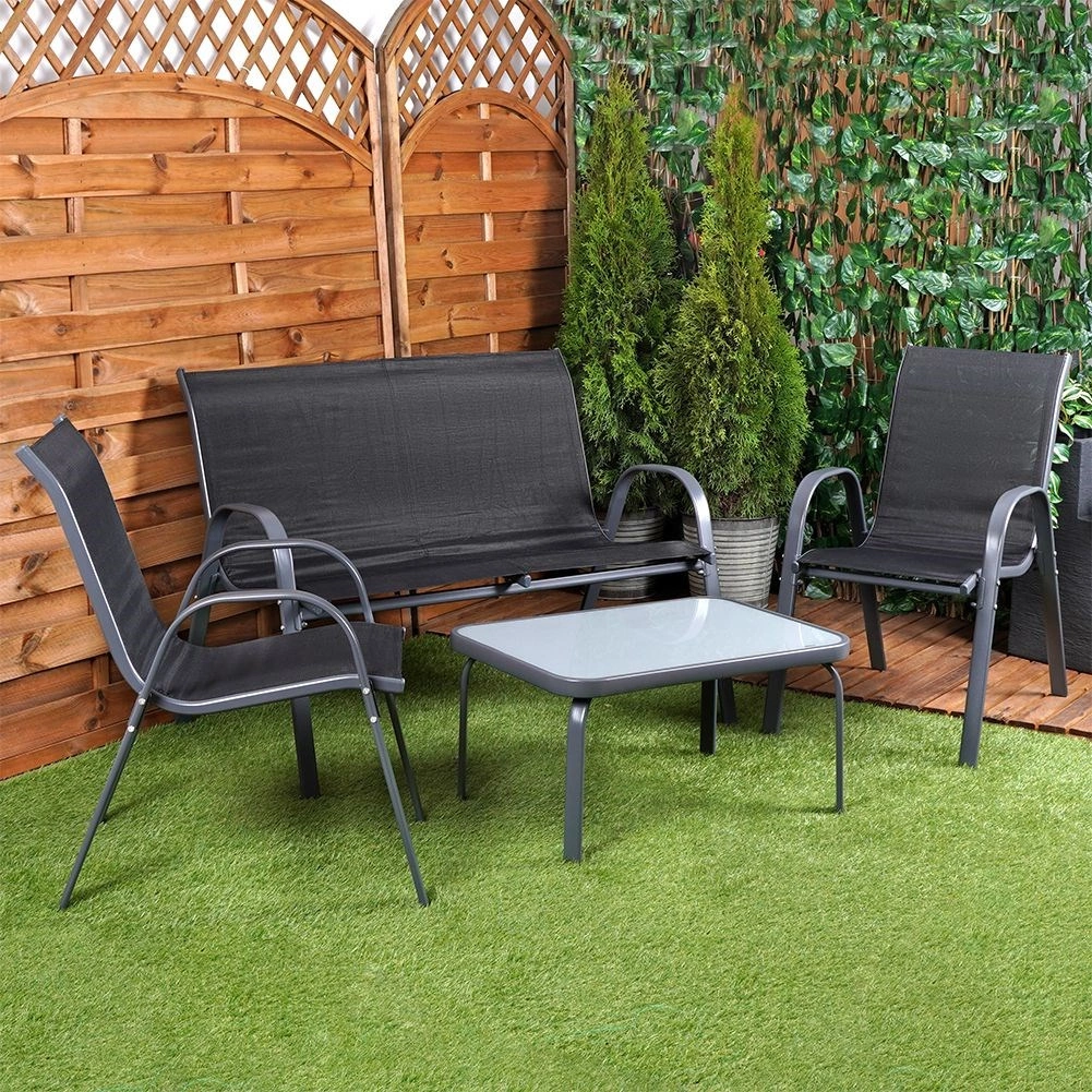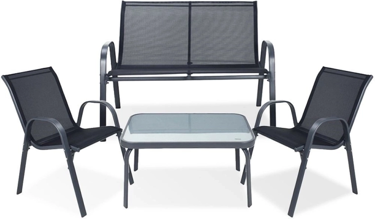 Stylová sada zahradního nábytku pro 4 osoby obsahuje 2 křesla, 2místnou lavici a konferenční stolek se skleněnou deskou. Odolná kovová konstrukce v šedé barvě a prodyšné textilní výplety z polyesteru zajišťují dlouhou životnost a pohodlí. Ideální na terasu, balkon i zahradu.
