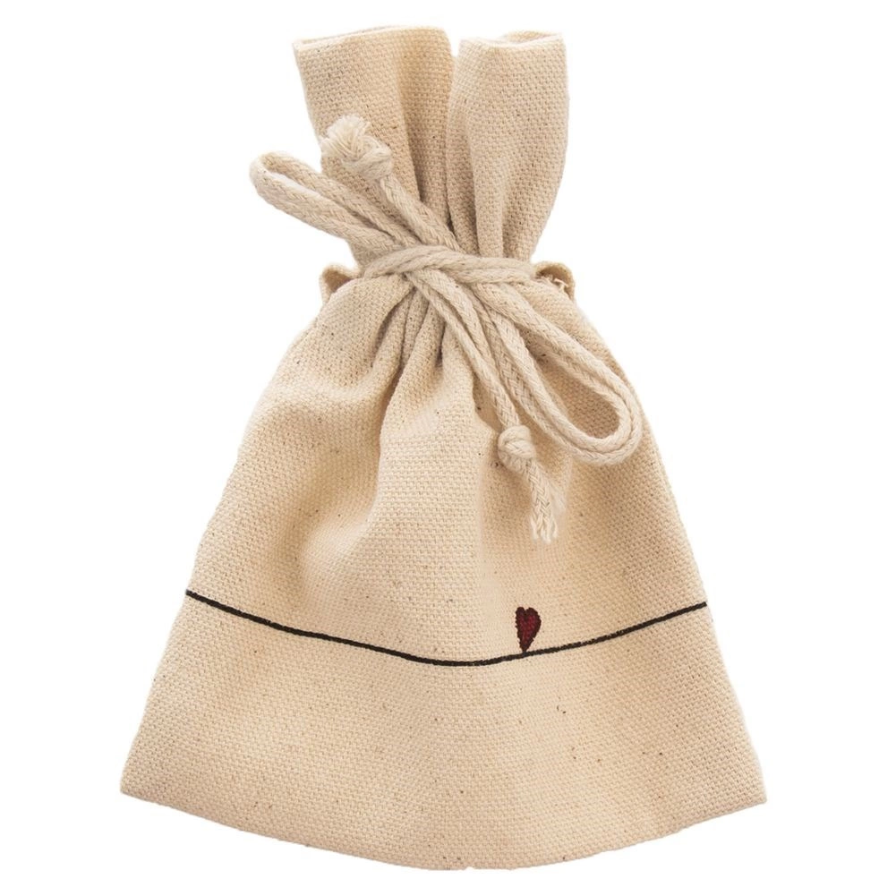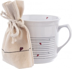 V balení najdete i praktický bavlněný sáček v béžové barvě se srdíčkem – ideální na sypaný čaj, bylinky nebo jako dárkové balení. Hrnek je snadno udržovatelný, vhodný do myčky nádobí a do mikrovlnné trouby; sáček lze prát do 30 °C.