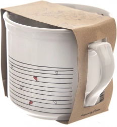 Kvalitní bílá keramika s dekorem srdíček, vhodná do myčky i mikrovlnné trouby. Plochá základna umožní i ohřev nápojů na plotýnce.