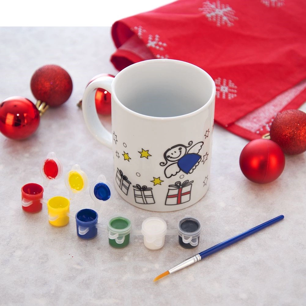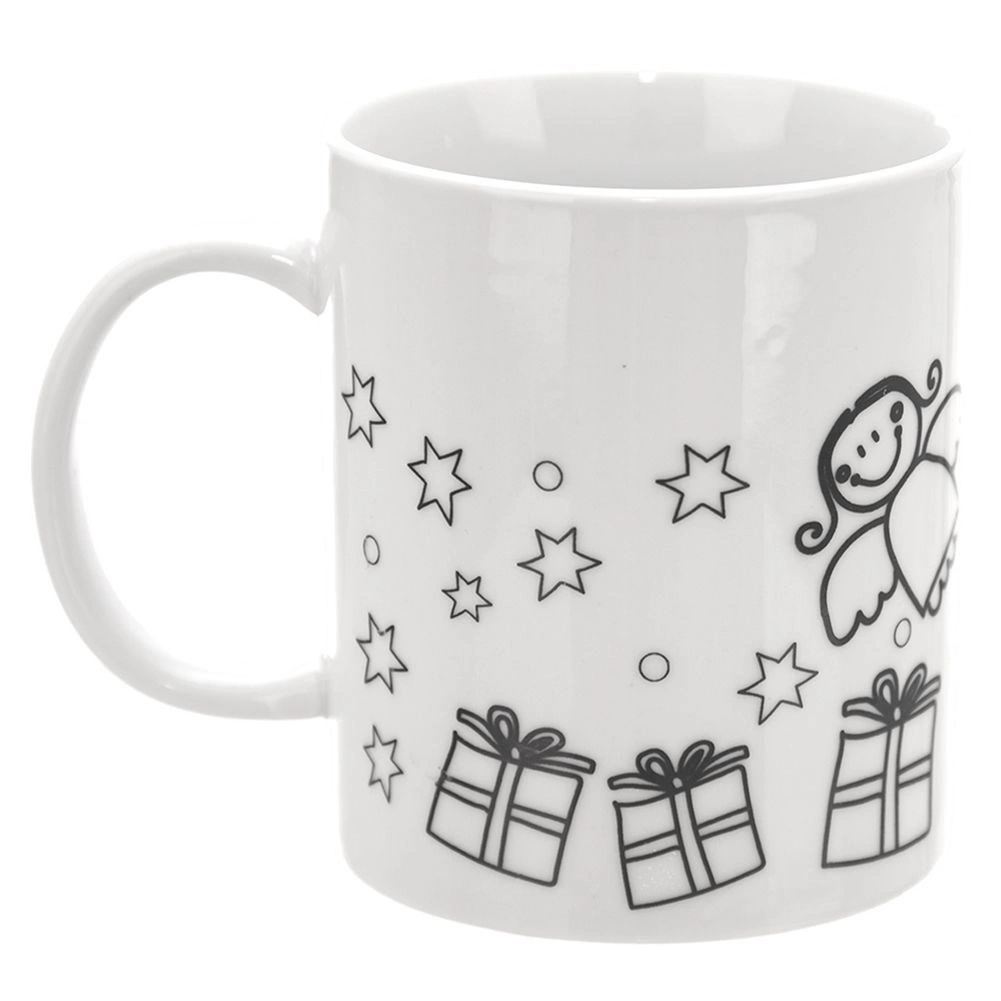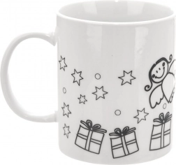 Vytvořte si svůj vlastní vánoční hrnek! Tento porcelánový hrnek k vymalování o objemu 350 ml má předtištěné obrysy stromku, dárků, hvězdiček a andílka a v balení najdete štětec a 6 akrylových barev. Hrnek je vhodný do myčky i mikrovlnky a po vypálení v troubě si dlouho uchová zářivé barvy.