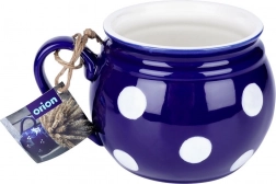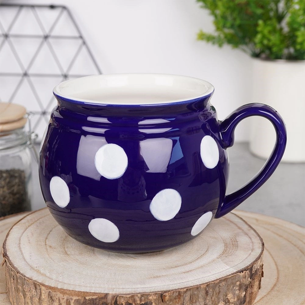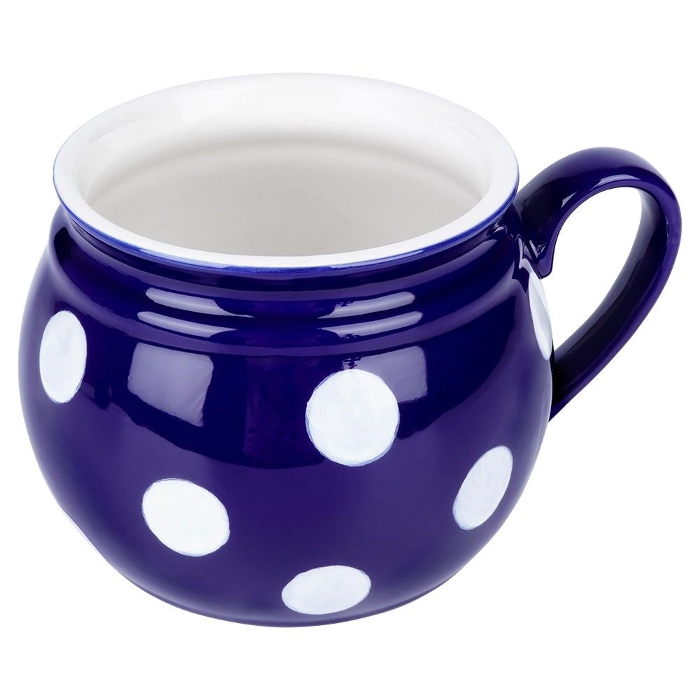 Velký keramický hrnek s uchem o objemu 850 ml v elegantní tmavě modré barvě s bílými puntíky. Má pohodlné ucho, tvar „soudku“ a je vhodný na čaj, kávu, kakao i svařené víno. Lze jej mýt v myčce a používat v mikrovlnce, takže je ideální pro každodenní použití.
