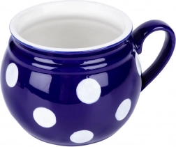 Užijte si oblíbené nápoje ve velkém stylu. Tento keramický hrnek s objemem 850 ml je skvělou volbou pro všechny, kdo mají rádi větší porce čaje, kávy nebo bylinkových nálevů. Klasický soudkovitý tvar, tmavě modrá glazura a bílé velké puntíky dodají prostřenému stolu šmrnc a skvěle ladí s dalšími kousky nádobí.