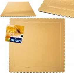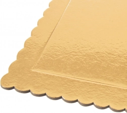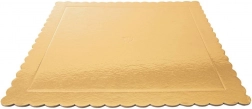Elegantní čtvercová podložka pod dort o rozměru 34 × 34 cm pro stylovou prezentaci a bezpečný transport. Je oboustranná, ve zlaté barvě, z pevné kartonové desky a s ochrannou fólií proti vlhkosti – ideální i do lednice.