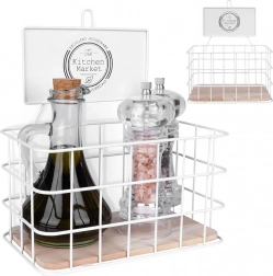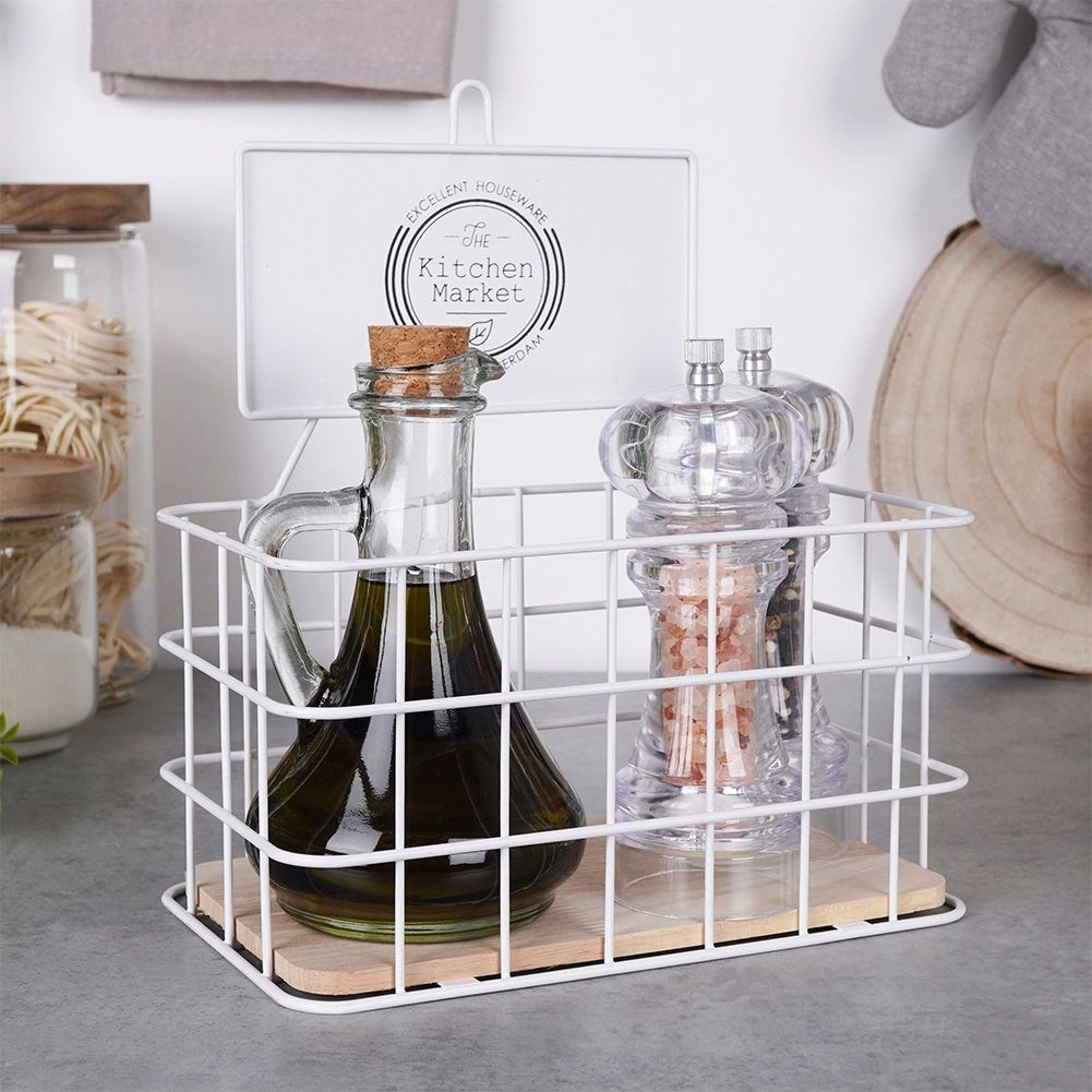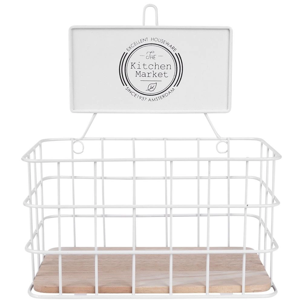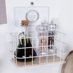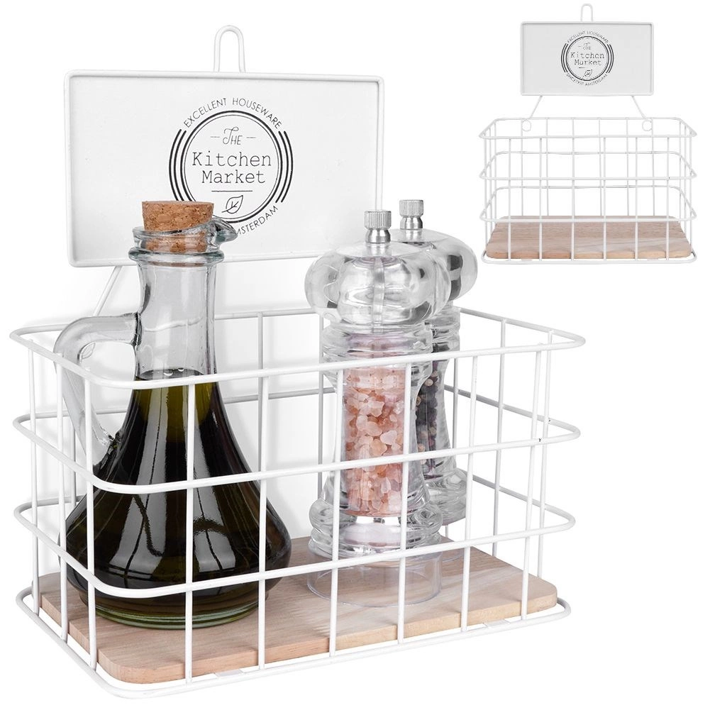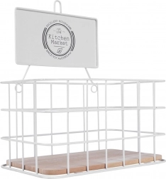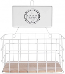 Tato nadčasová kuchyňská polička v kombinaci bílého kovu a dubového dřeva skvěle zapadne do moderních i klasických interiérů. Otevřený drátěný design zajišťuje přehlednost a rychlý přístup k uloženým předmětům, dekorativní nápis „The Kitchen Market“ dodává šarm.