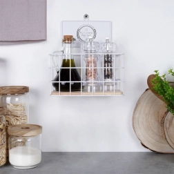 Elegantní bílá kovová polička s dubovým dnem přináší praktické a stylové řešení pro organizaci kuchyně. Kompaktní rozměry 21 × 12,5 × 24 cm šetří místo, pevná kovová konstrukce s práškovým lakem zaručuje stabilitu a univerzální využití na kořenky, oleje i drobné kuchyňské potřeby. Lze zavěsit na stěnu nebo postavit na pracovní desku.