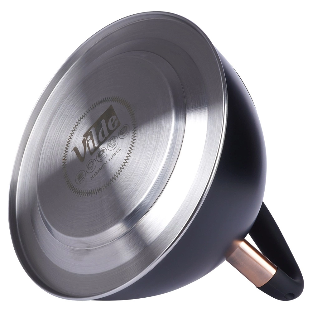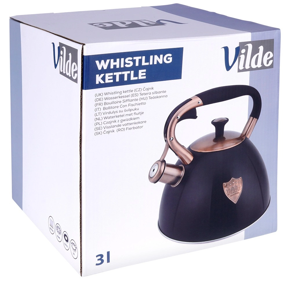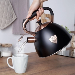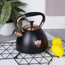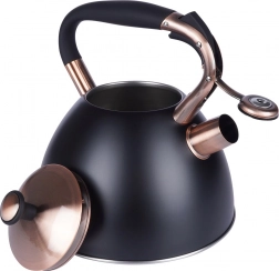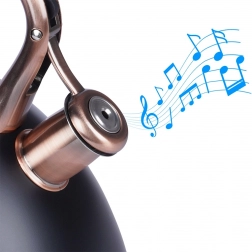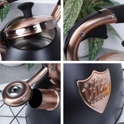 Stylová ocelová konvice s píšťalkou o objemu 3 l v matné černi s měděnými akcenty přináší rychlé ohřívání vody a pohodlné nalévání. Z kvalitní nerezové oceli, s ergonomickým úchopem Soft Touch, automatickým píšťalkovým víčkem a vícevrstvým akutermickým dnem pro rychlý ohřev na všech typech sporáků včetně indukce.