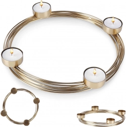 Tento stylový svícen z kvalitního kovu v luxusní zlaté úpravě pojme až čtyři čajové svíčky a rozzáří váš interiér příjemným ambientním světlem. Díky čistému, kruhovému tvaru s více drátěnými prstenci vyniká moderním minimalistickým vzhledem, který perfektně ladí s moderními i klasickými interiéry.
