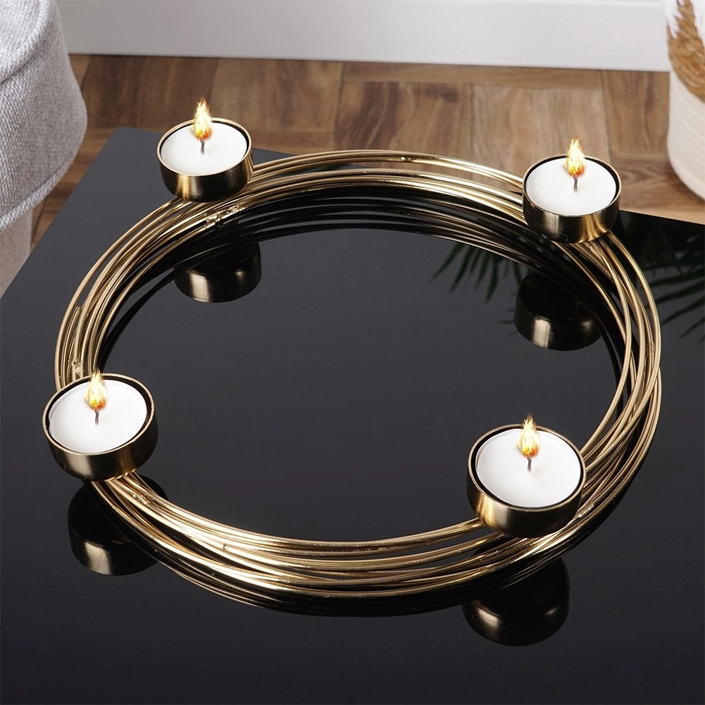 Kruhová konstrukce s čtyřmi rovnoměrně rozmístěnými miskami bezpečně drží malé svíčky a vytváří harmonické ambientní světlo.