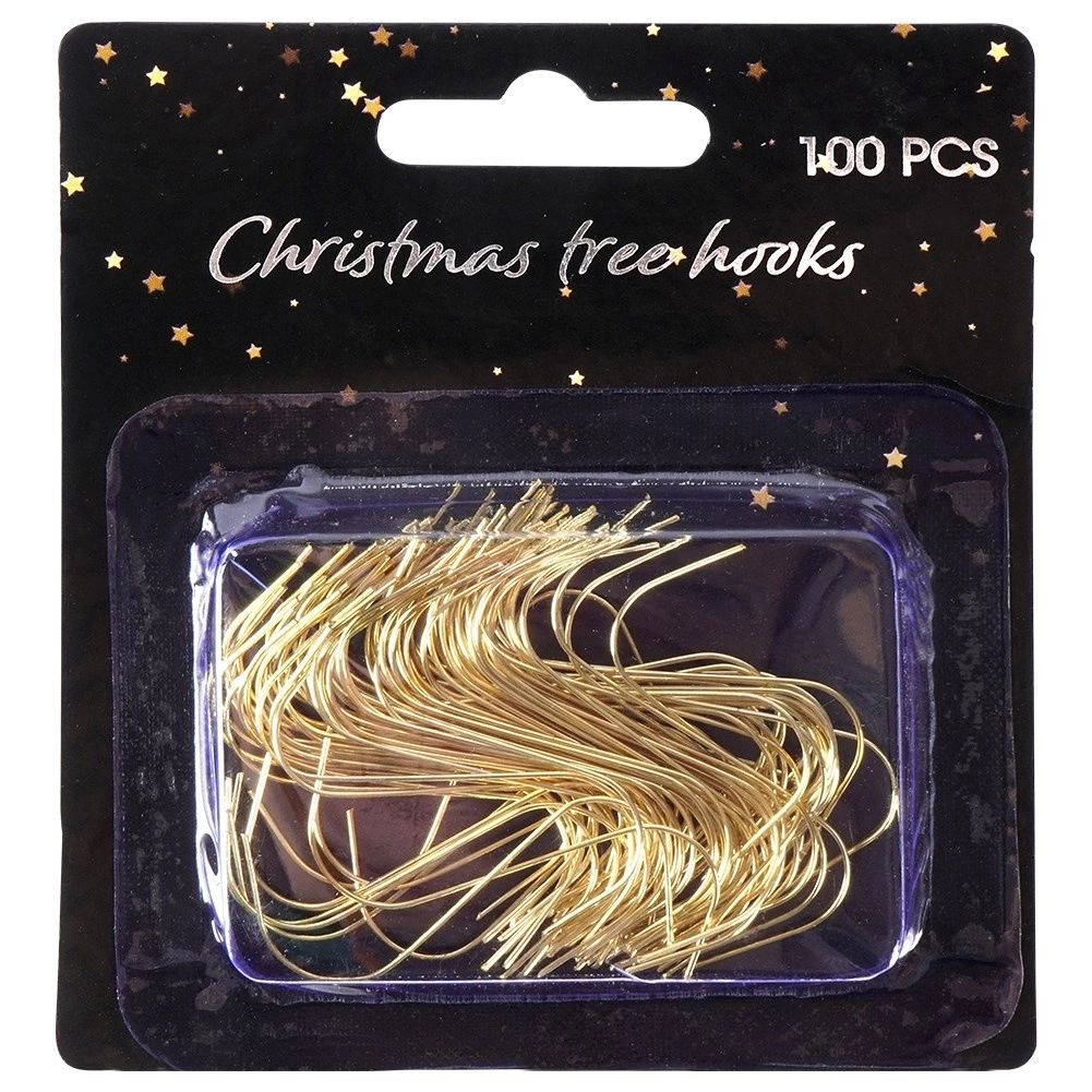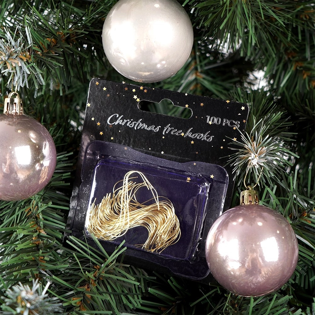 Praktická sada 100 kovových háčků v zlaté barvě pro snadné a bezpečné zavěšení vánočních ozdob na stromeček. Díky délce 4 cm se skvěle hodí pro různé typy a velikosti dekorací, jsou pevné, opakovaně použitelné a mají ergonomický tvar pro rychlé připevnění bez námahy – i pro děti.
