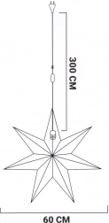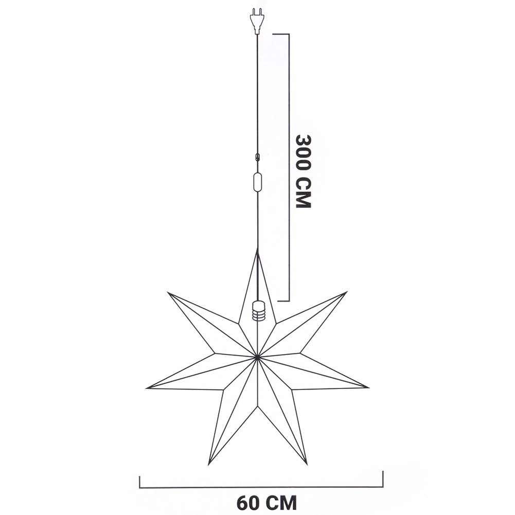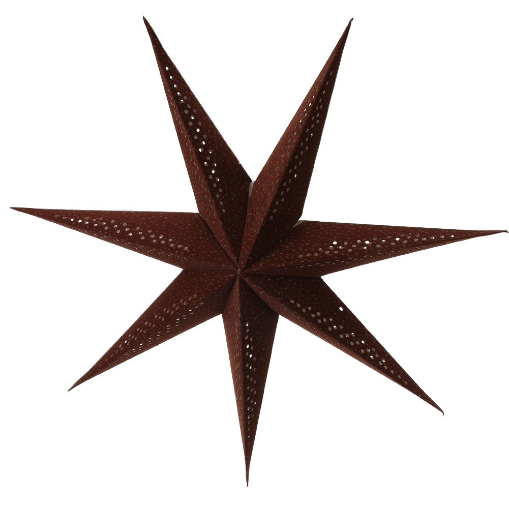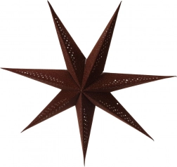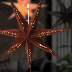 Elegantní závěsná hvězda o průměru 60 cm z pevného papíru s hebkým sametovým povrchem v hnědé barvě a zlatými třpytivými detaily. Po rozsvícení vytvoří jemné, atmosférické světlo a dodá interiéru sváteční i celoroční kouzlo. Je napájena ze sítě, má vypínač, 3m kabel a je určená pro žárovku E14 (max. 25 W, není součástí). Ideální do okna, na stěnu či kamkoli, kde chcete podtrhnout útulnou atmosféru.