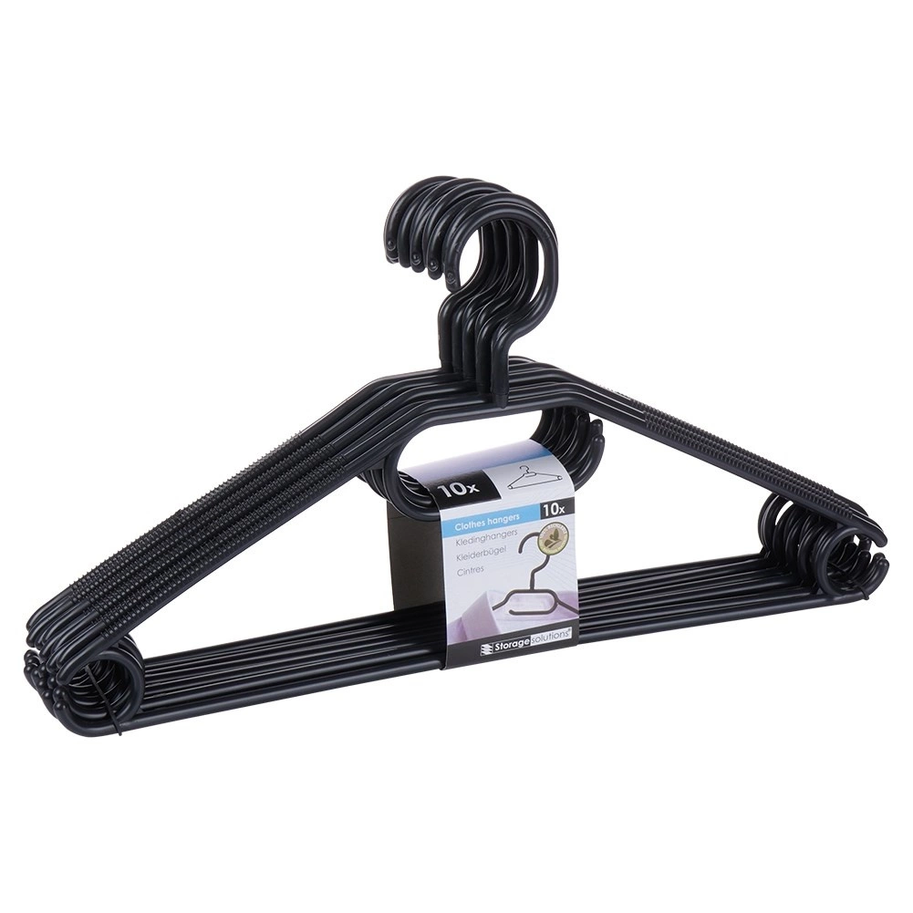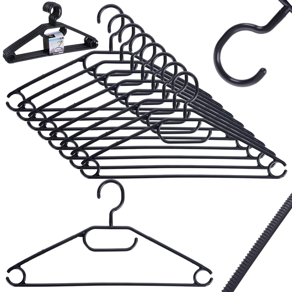 Udržte svůj šatník přehledný se sadou 10 kvalitních věšáků v elegantní černé barvě. Díky otočnému háčku je snadno umístíte do jakékoli skříně, zatímco více závěsných bodů umožní zavěsit košile, saka, sukně, kalhoty i doplňky jako šály či kravaty.
