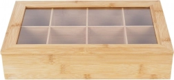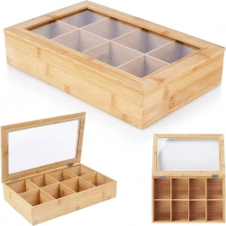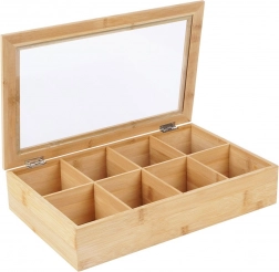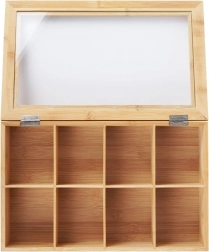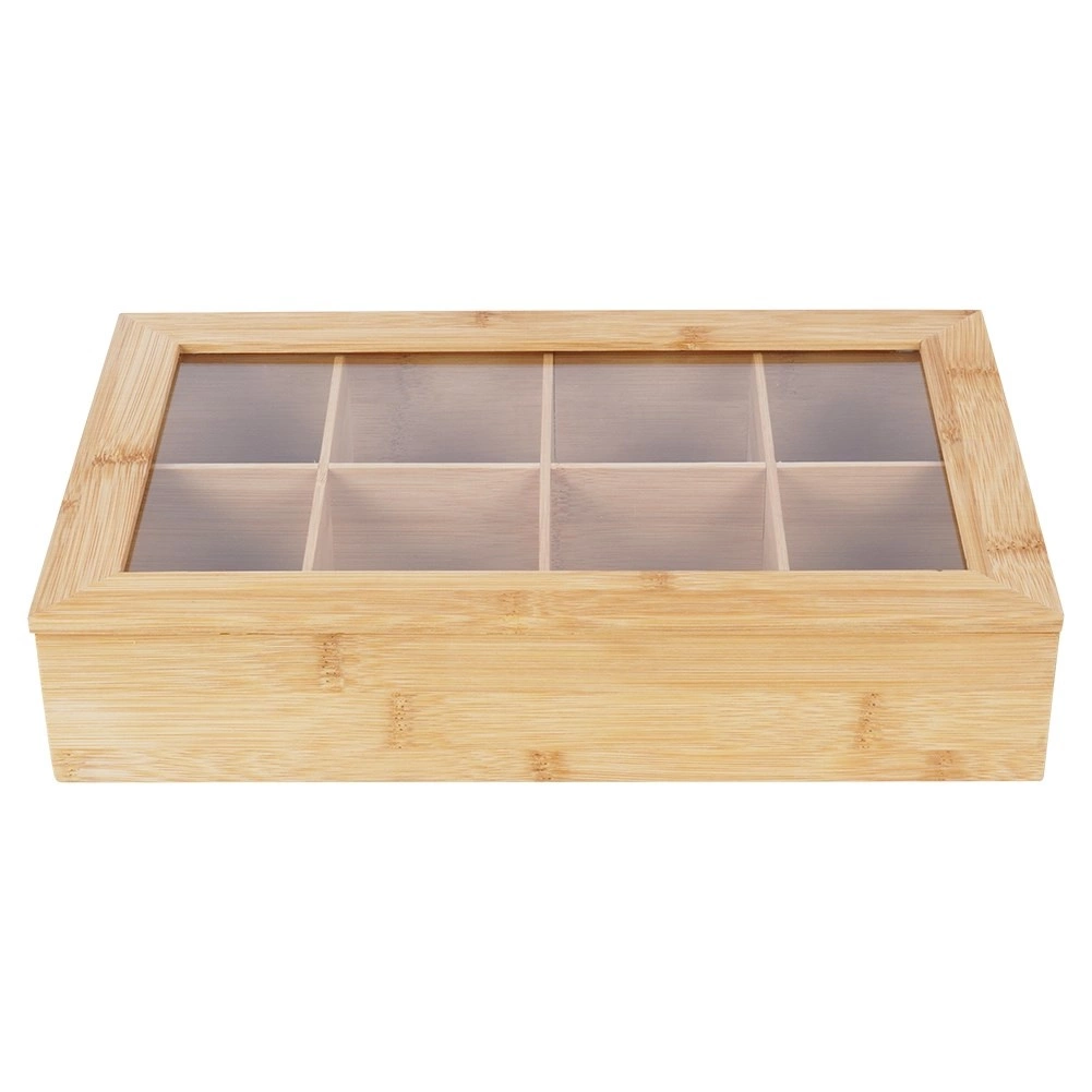 Elegantní bambusová krabička na čaj s 8 přihrádkami a průhledným víkem udrží vaše oblíbené čaje přehledně uspořádané a déle čerstvé a voňavé. Přírodní bambus je odolný vůči vlhkosti, nedeformuje se a neabsorbuje pachy, takže je ideální do kuchyně i gastronomických provozů.