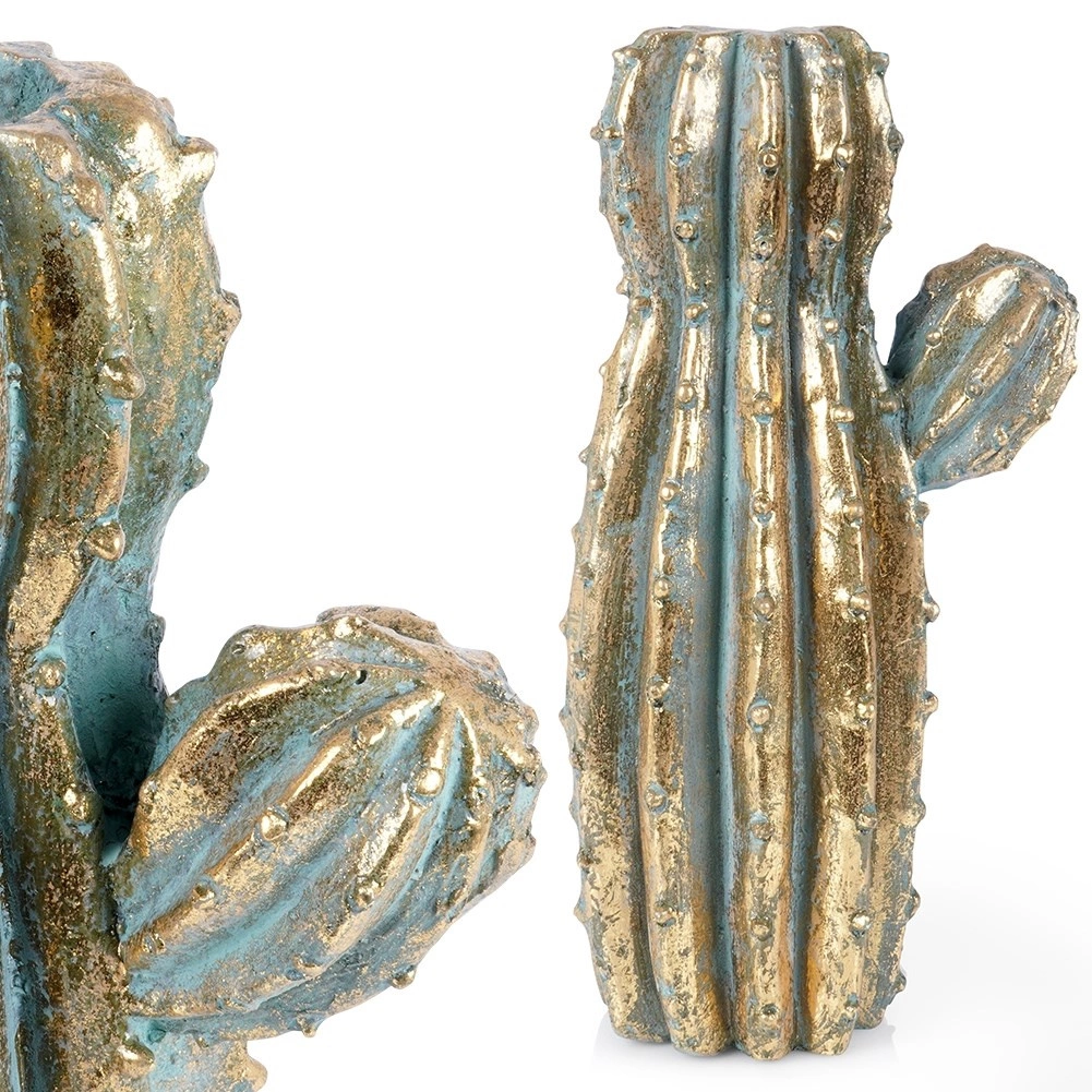 Stylová váza ve tvaru kaktusu se zlatým metalickým efektem dodá interiéru jedinečný lesk. Je ideální pro čerstvé i sušené květiny, dekorativní větvičky i jako designový solitér. Díky realistické textuře a kvalitnímu zpracování působí jako luxusní doplněk do obýváku, ložnice i kanceláře.