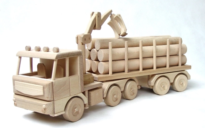 Velký dřevěný tahač s kládami o délce 70 cm potěší malé řidiče i milovníky kvalitních hraček. Nabízí pohyblivé rameno, odnímatelné klády a otáčivý přívěs pro realistickou hru. Je vyroben z kvalitního bukového dřeva se zaoblenými hranami a precizním zpracováním, takže dlouho vydrží a je bezpečný pro děti od 3 let.