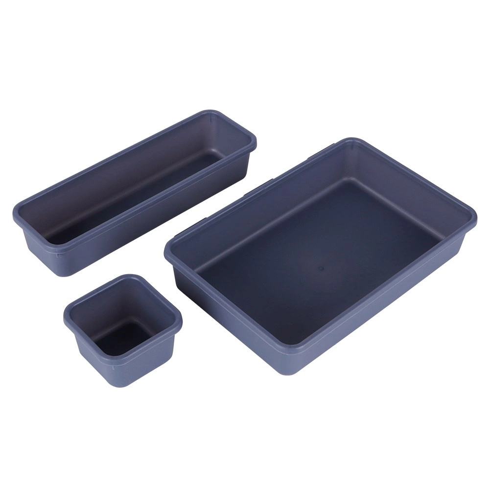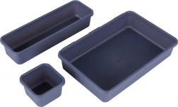 Díky odolnému plastu s hladkým povrchem se organizéry snadno udržují, nepoškrábou obsah a při nepoužívání je jednoduše zasunete do sebe, takže zaberou minimum místa. Grafitová barva působí moderně a ladí s většinou interiérů.