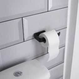 Stylový a odolný držák na toaletní papír v matně černém provedení. Nabízí moderní minimalistický design, snadnou výměnu rolí a dva způsoby montáže – lepením bez vrtání nebo klasicky se šrouby. Kompaktní rozměry pro pohodlné každodenní používání.