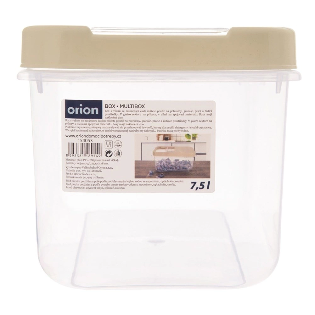 Tento univerzální box s objemem 7,5 l pomůže udržet pořádek v kuchyni, spíži i koupelně. Průhledné tělo umožňuje okamžitou kontrolu stavu zásob bez otevírání a bežové víko s posuvným uzávěrem zajišťuje pohodlné dávkování i rychlý přístup.