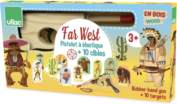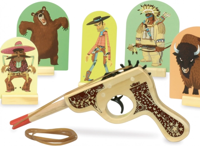 Zažijte atmosféru Divokého západu s touto dřevěnou pistolí s terči od značky VILAC. Hra je ideální pro děti od 3 let a pomáhá trénovat přesnost, soustředění a jemnou motoriku. Stačí natáhnout gumičku, postavit terče a začít střílet – zábava pro celou rodinu.