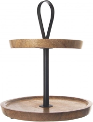 Stylová dvoupatrová etažér z exotického dřeva mangovníku s černou kovovou konstrukcí je ideální pro servírování a prezentaci dezertů, ovoce a občerstvení. Nabízí dvě patra pro úsporu místa, stabilní provedení, praktické madlo pro přenášení a protiskluzové podložky pro ochranu stolu. Skvěle ladí s interiéry ve stylu LOFT.