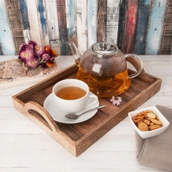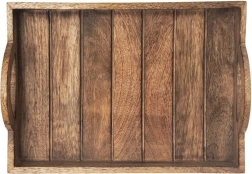 Obdélníkový servírovací tác z mangového dřeva vyniká svou pevností, odolností proti vlhkosti a přirozenou kresbou. Díky integrovaným úchytům se pohodlně přenáší káva, čaj, dezerty i celé snídaně. Protiskluzové podložky na spodní straně chrání stůl a zajišťují stabilitu.