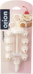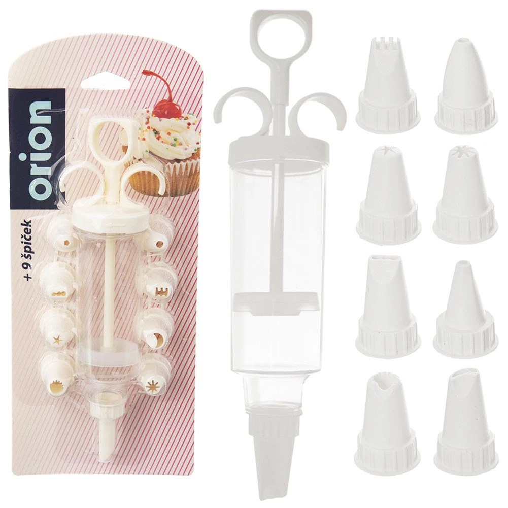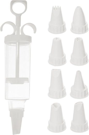 Praktická sada pro zdobení dortů, zákusků a jednohubek s 9 výměnnými špičkami a přesným pístovým dávkováním. Odolné provedení z kvalitního plastu, průhledné tělo pro kontrolu množství krému a snadné používání i čištění. Ideální pro krémy, šlehačku i náplně.