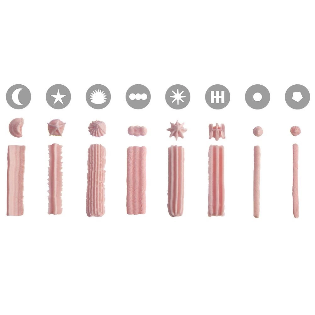Sada obsahuje různé tvary špiček – kulaté, hvězdičkové, ploché i okvětní – pro profesionální dekorace i doma.