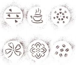 Vytvářejte srdíčka, květy či kávová zrna jednoduše prosátím kakaa nebo cukru přes šablonu – ideální pro cappuccino i latte.