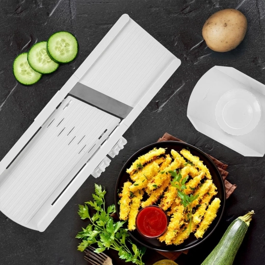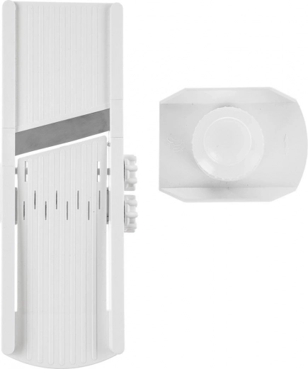 Tato odolná mandolína v bílé barvě kombinuje rychlost, přesnost a bezpečnost při krájení ovoce i zeleniny. Plynulá regulace tloušťky pomocí bočního ovladače umožní řezat od extra tenkých plátků až po silnější plátky do 8 mm – ideální na okurky do salátu, plátky na gril, křupavé chipsy i domácí hranolky.