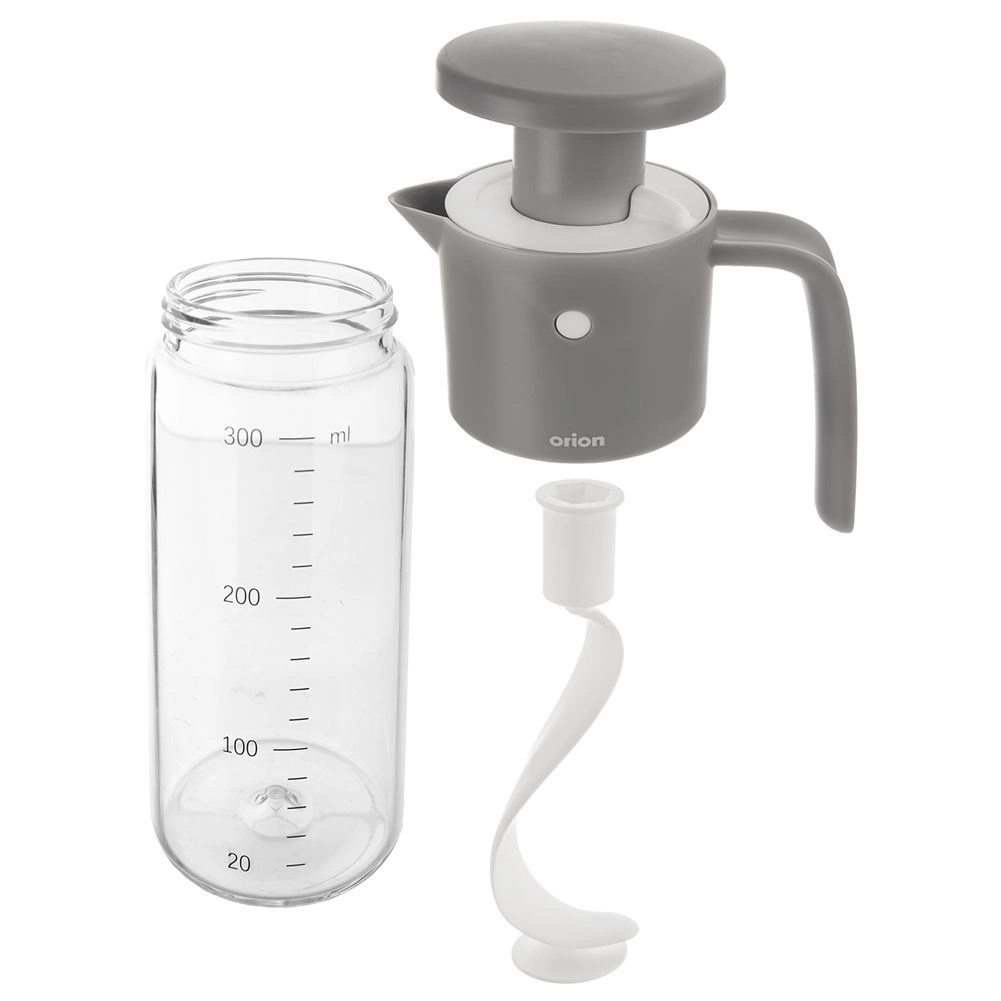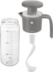 Tato univerzální láhev funguje jako ruční mixér – píst v uzávěru pohání spirálové míchadlo, které rychle a rovnoměrně spojuje ingredience, jako jsou olej, ocet, med, hořčice či koření. Integrovaná odměrka od 20 do 300 ml po 20 ml zajišťuje přesné poměry pro každý recept.
