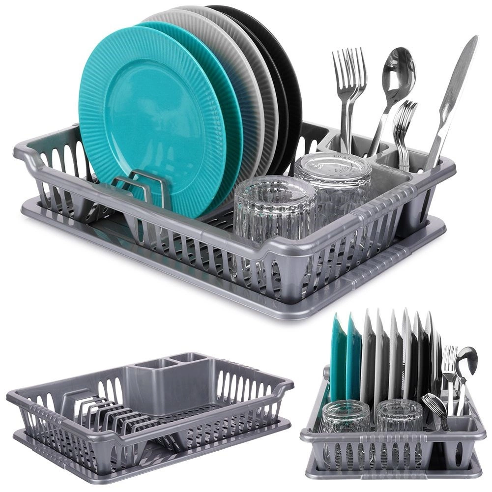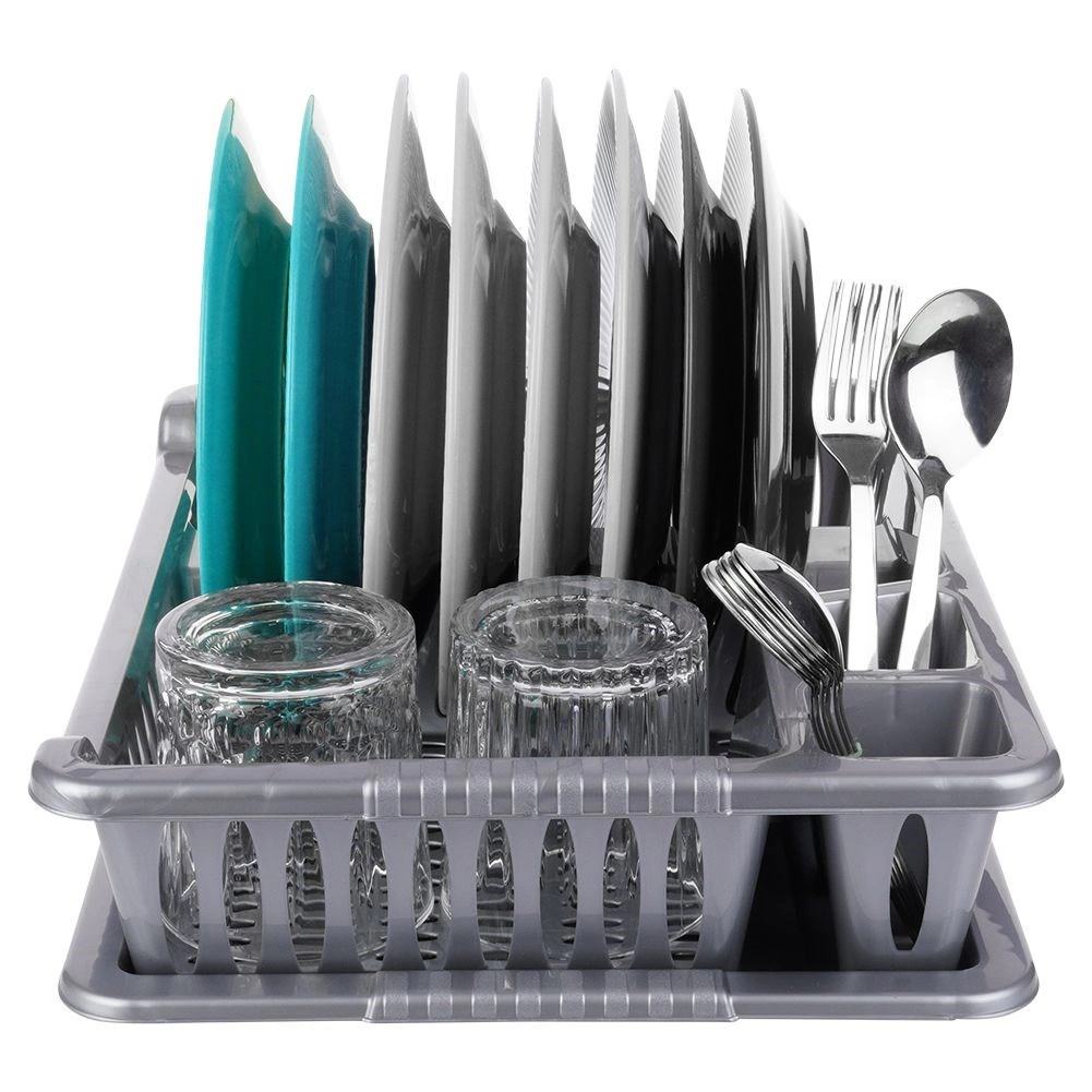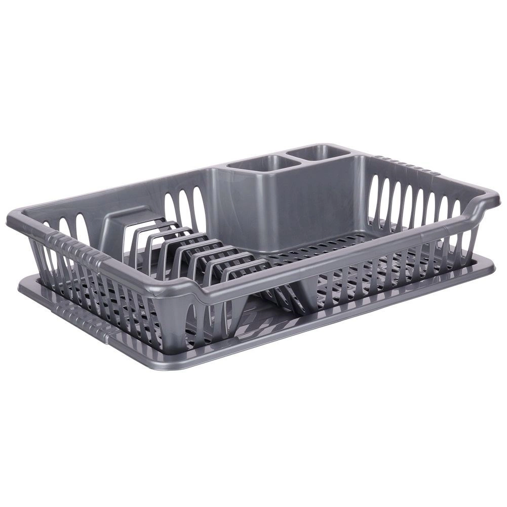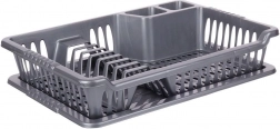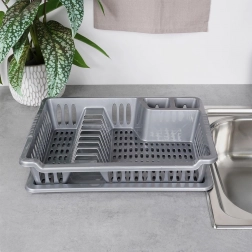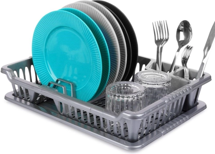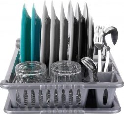 Praktický šedý odkapávač na nádobí s rozměry 40 × 29 × 8,5 cm udrží kuchyňskou linku suchou a nádobí přehledně uspořádané. Má vyjímatelnou odkapávací tácku, místa pro talíře, hrnky i příbory a je vyroben z kvalitního plastu bez BPA. Ideální pro každodenní použití, snadno se čistí a hodí se do moderních i klasických kuchyní. Bez BPA, odnímatelná tácka, prostor pro 8 talířů, praktické přihrádky na příbory.