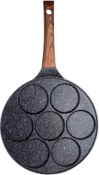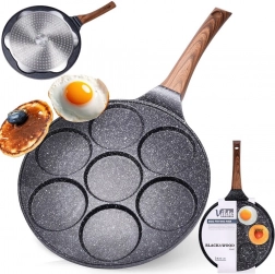 Univerzální pánev na vejce a lívance se 7 kulatými formami o průměru 8 cm zajistí dokonalý tvar a rovnoměrné propečení. Odolné hliníkové tělo s nepřilnavým granitovým povrchem umožní vařit s minimem tuku, ergonomická rukojeť s imitací dřeva je pohodlná a bezpečná. Díky rovnoměrnému rozvodu tepla šetří čas i energii a je vhodná na plyn, elektřinu, keramiku, halogen i indukci.