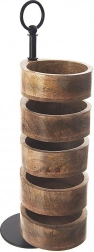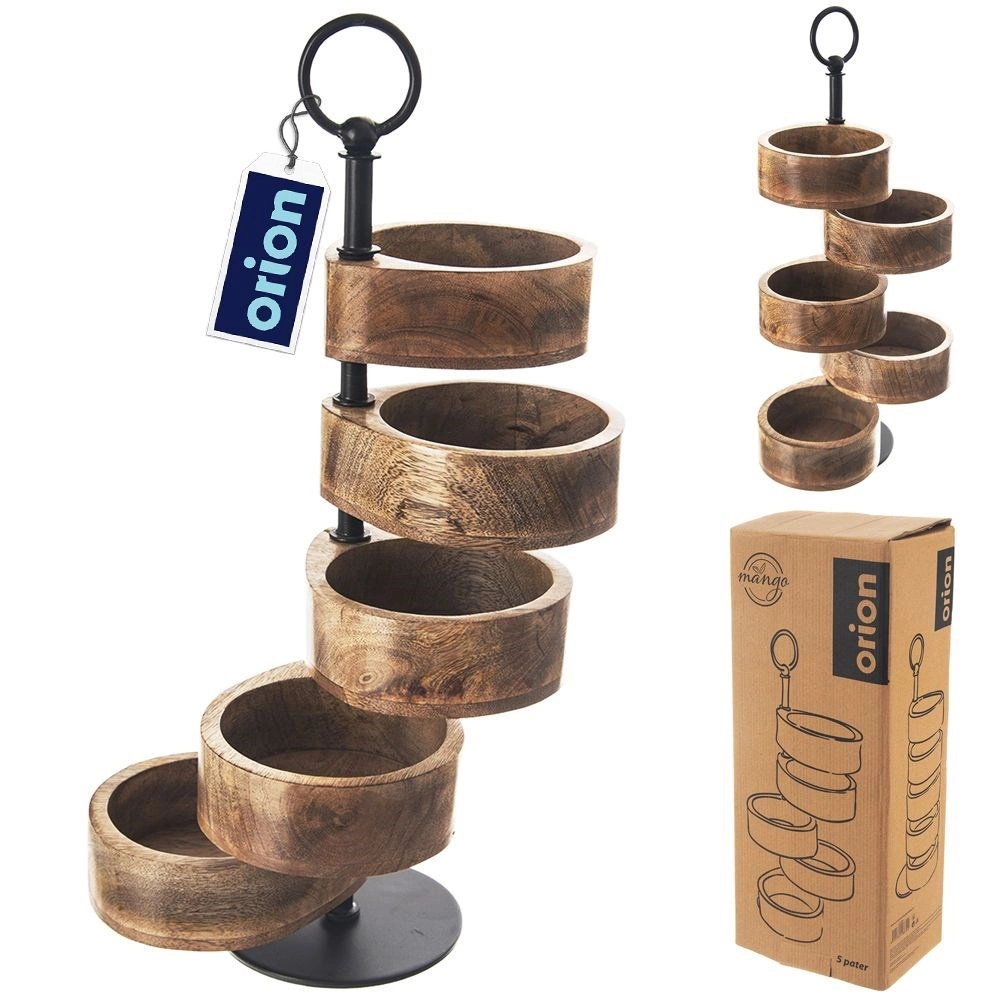 Tato víceúrovňová patera z mangového dřeva s výškou 44,5 cm přináší elegantní způsob, jak servírovat oříšky, chipsy, sušené ovoce, cukrovinky, sušenky či tapas. Pět samostatně otočných misek umožní atraktivní aranžmá a snadný přístup pro hosty. Přírodní dřevo mangovníku je odolné vůči vlhkosti a deformacím, nenasává pachy a rychle schne.