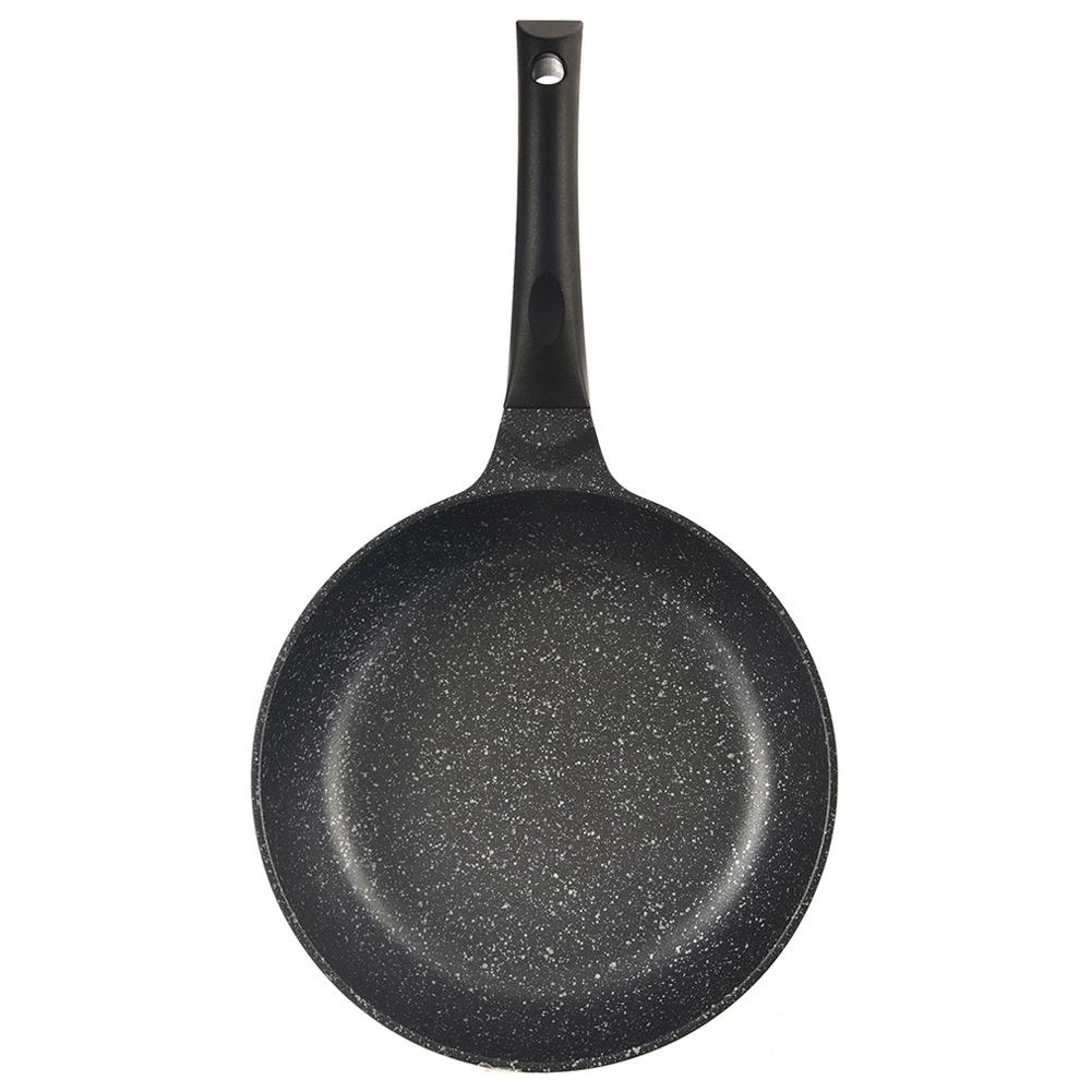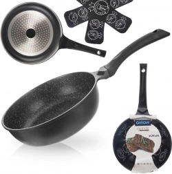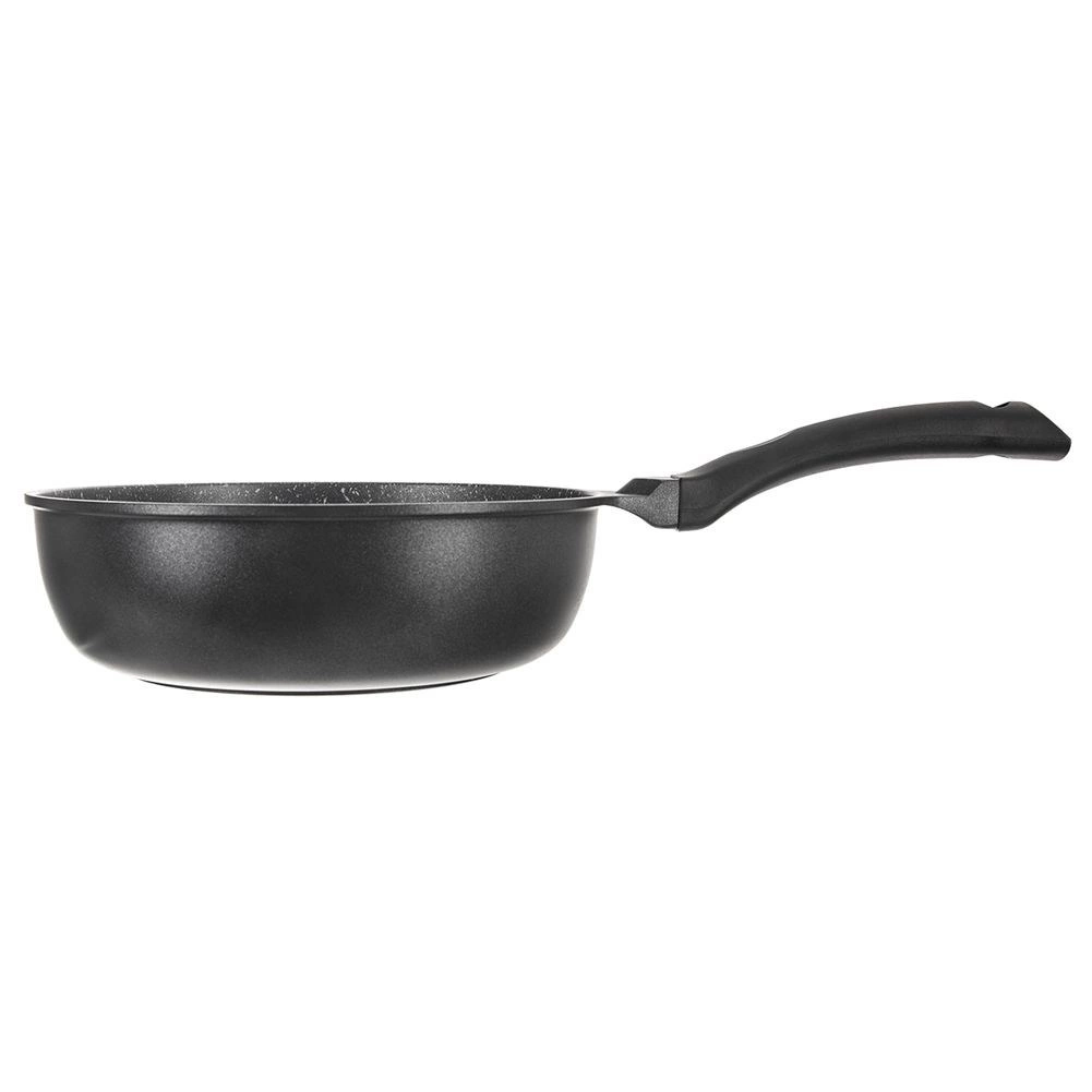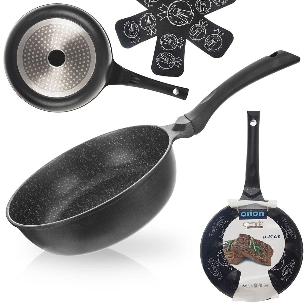 Hluboká nepřilnavá pánev o průměru 24 cm z odolného hliníkového odlitku nabízí rychlé a rovnoměrné rozložení tepla, nepřilnavý granitový povrch bez PFOA a univerzální použití na všechny typy sporáků včetně indukce. Díky vysokému okraji je ideální na smažení i dušení, šetří energii a umožňuje vařit s minimem tuku. Součástí je ochranná filcová podložka pro bezpečné stohování.
