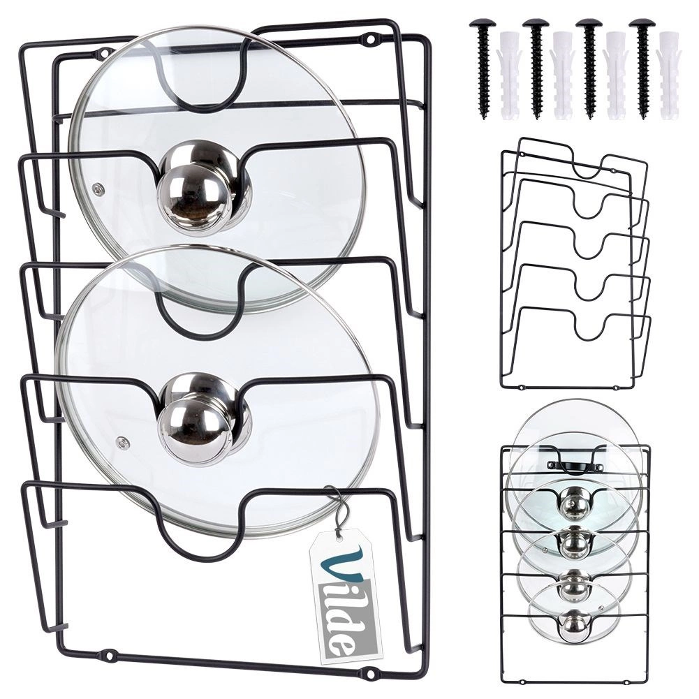 Čtyři až pět tierů pro bezpečné uložení vík různých velikostí – okamžitý přehled a pořádek v kuchyni.