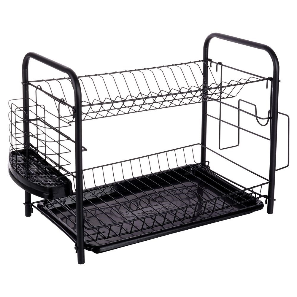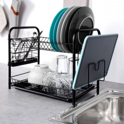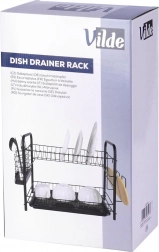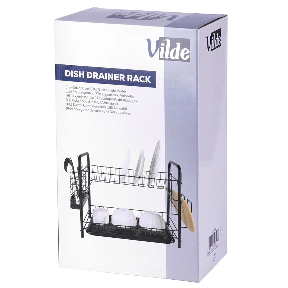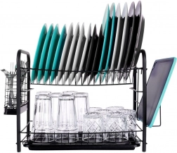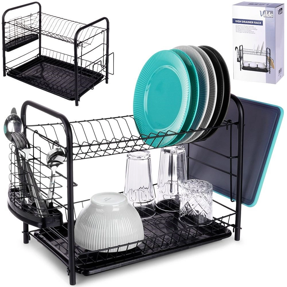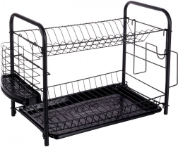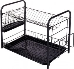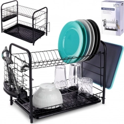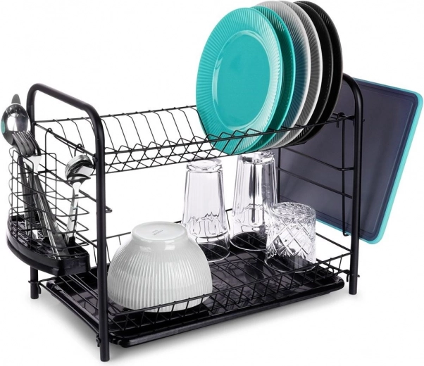 Praktický dvouúrovňový odkapávač na nádobí v černé barvě šetří místo na lince a urychlí sušení talířů, sklenic a příborů. Díky dvěma patrum je mimořádně prostorný, má odnímatelnou odkapávací tácu, držák na prkénko a samostatný košík na příbory. Robustní kovová konstrukce v industriálním stylu zajistí dlouhou životnost a stabilitu.
