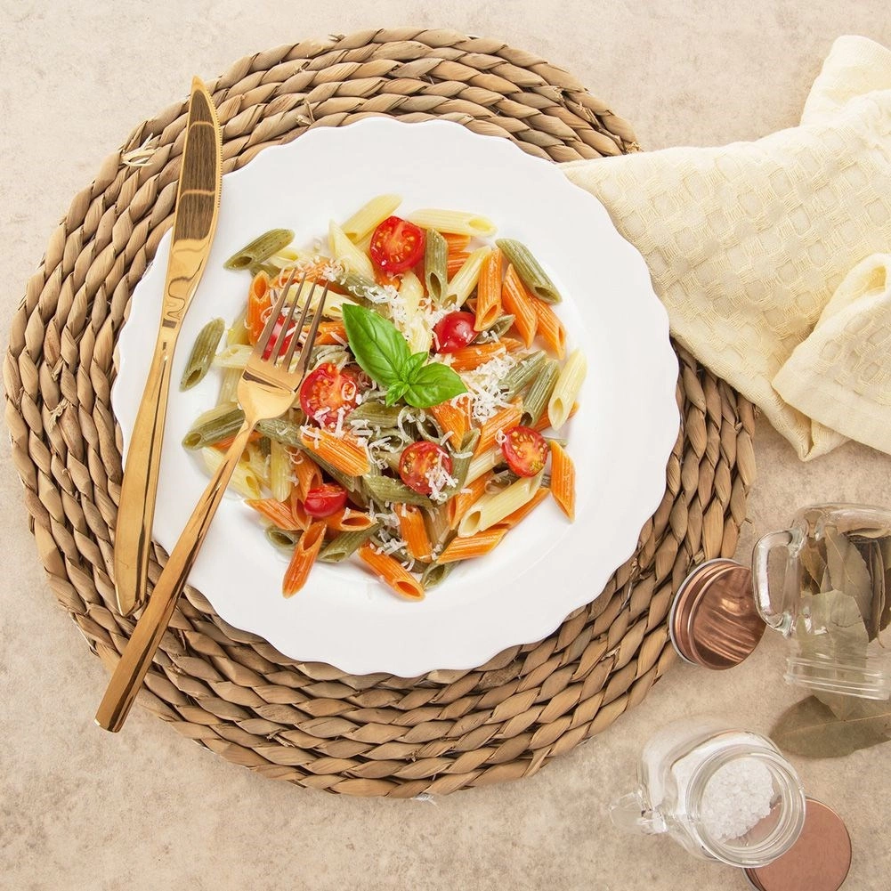 Univerzální porcelánový talíř MONA vyniká čistou bílou barvou a elegantním zvlněným lemem, který pozvedne vzhled každého stolování. Díky průměru 24,5 cm je ideální na obědy, večeře i větší dezerty, a skvěle se kombinuje s dalšími kousky z jedné série.
