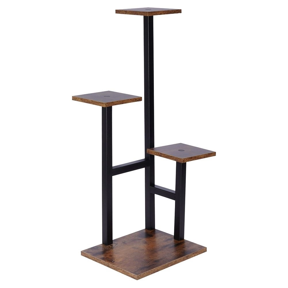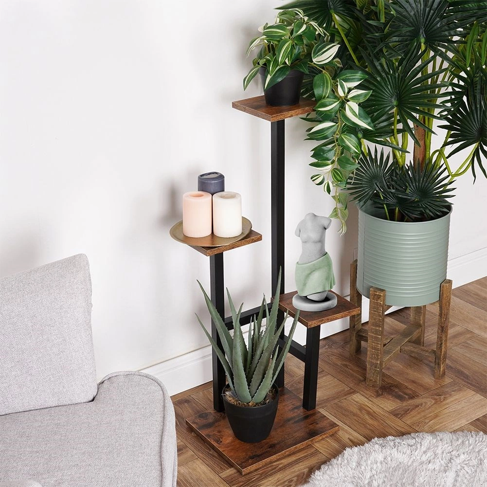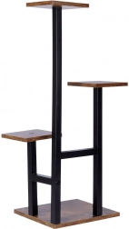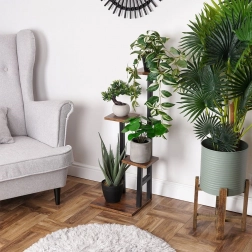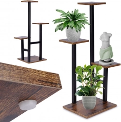 Tento víceúrovňový stojan na květiny kombinuje černou kovovou konstrukci s policemi z MDF v dekoru tmavého dřeva. Jeho stupňovitý design umožňuje efektně vystavit více rostlin na malém půdorysu a vytvořit atraktivní zelenou kompozici v každém interiéru.