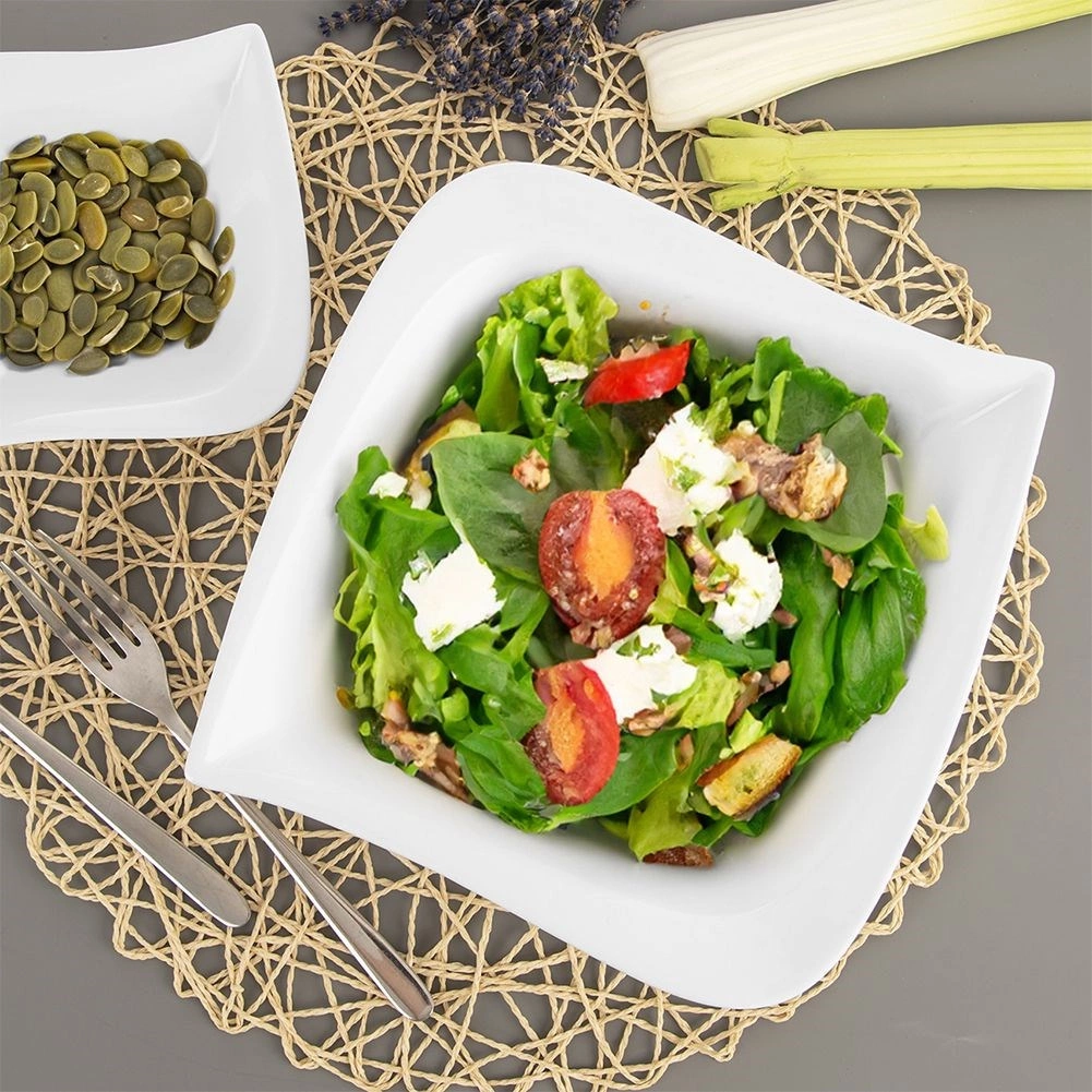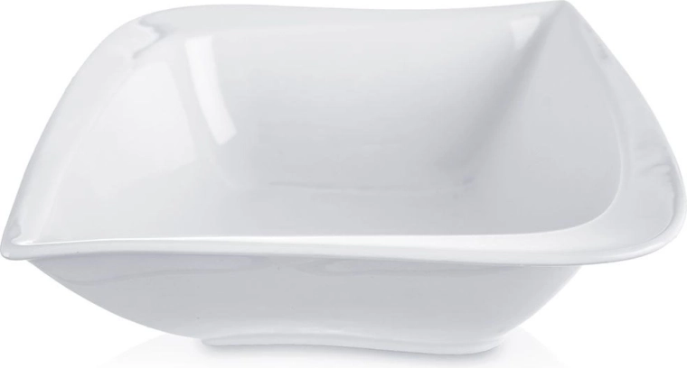 Stylová miska z kvalitní porcelánu v bílé barvě je skvělou volbou pro každodenní stolování i slavnostní příležitosti. Díky hlubšímu profilu a tvaru nepravidelného čtverce pohodlně naservírujete zeleninové i ovocné saláty, přílohy nebo pochutiny jako chipsy a popcorn.