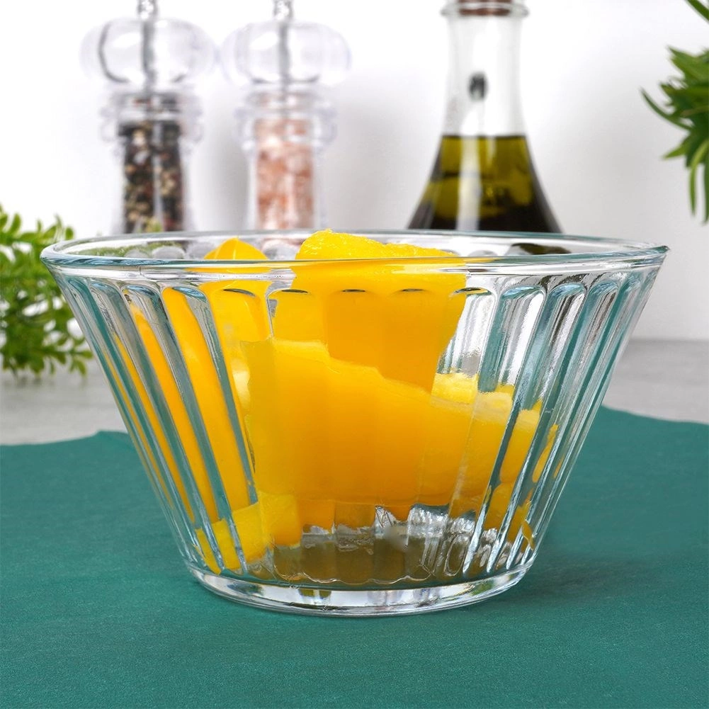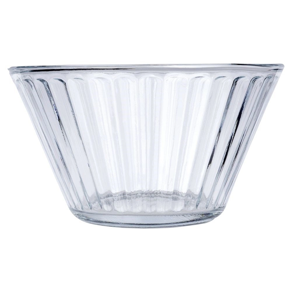 Sada tří univerzálních skleněných misek přináší ideální kombinaci praktičnosti a stylu. Transparentní sklo s vertikálním žebrováním dodává servírování elegantní vzhled, a přitom umožňuje dokonalou kontrolu nad obsahem. Hodí se na studené i teplé pokrmy.