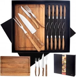 Součástí je robustní prkénko z akáciového dřeva pro krájení i servírování. Sada je uložena v elegantní dárkové krabici, proto je perfektním tipem na dárek. Využijete ji doma, u grilu i v provozech HoReCa.