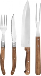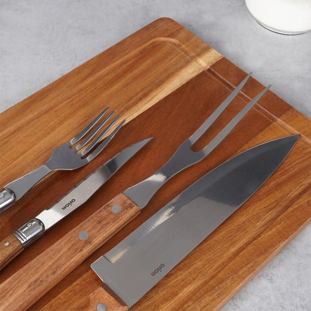 Tato všestranná sada propojuje precizní krájení a stylové servírování. Zoubkované čepele z nerezové oceli si poradí se steaky, burgery i pizzou, kuchařský nůž a masový vidlice usnadní porcování. Ergonomické rukojeti z akáciového dřeva s trojitým nýtováním zajišťují pevný a pohodlný úchop.