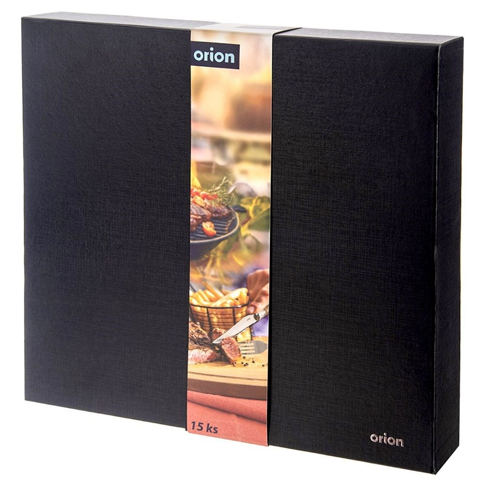 - 6× vidlička (22 cm), 6× steakový nůž (23 cm, čepel 11 cm), 1× kuchařský nůž (33 cm, čepel 21 cm), 1× masový vidlice (33 cm), 1× prkénko (37 × 23 × 1,5 cm)