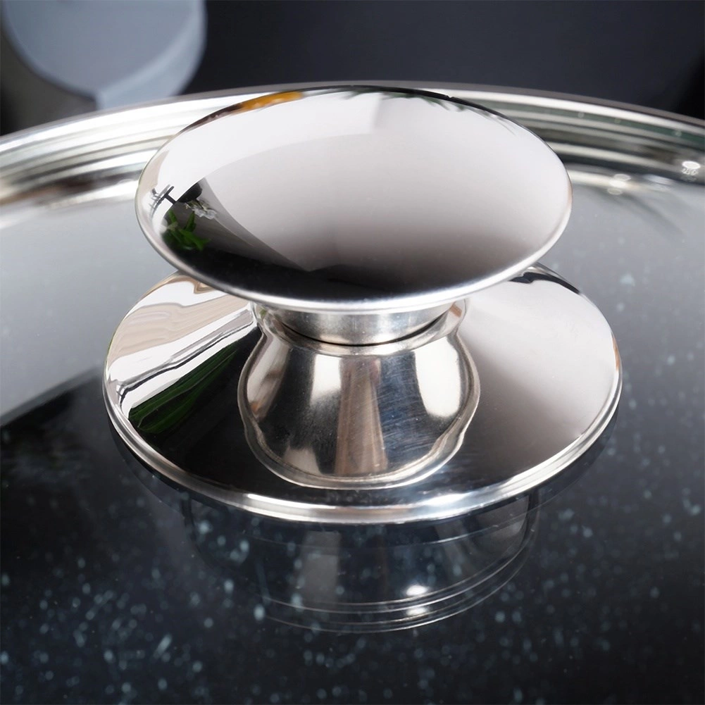 Poklice z tvrzeného skla s nerezovým knobem umožňuje kontrolu pokrmu a ventil bezpečně odvádí přebytečnou páru.